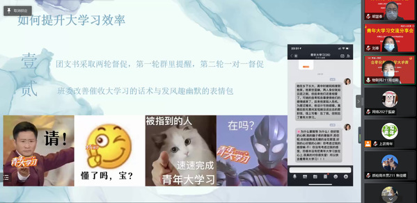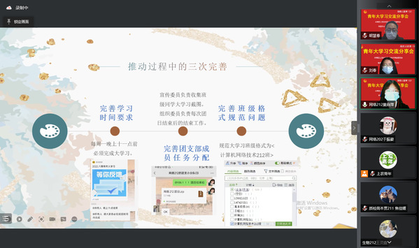 刘春老师表示,智工系高度重视青年大学习工作,建立并完善一系列动员组织和考核激励机制,即党总支指导、团总支督促、团支部积极行动,根据每期学习的要求,细化时间节点工作安排,系部团员青年学习主动性不断增强,取得明显学习成效。团总支副书记、网络201赵明婧表示,要不断加强毕业生团员的参与度,借鉴好的工作经验,让团员青年更好地学习党的理论与主张。学习之星代表网络201班金慈恩、软件211班沈欣彤结合自身学习情况以及对“青年大学习”的认识等方面表示要继续加强理论学习,将“青年大学习”的思想与内涵融入到个人的勤学强技实践中,不断做好表率。物联网211班周佳莉和网络212班巢自萍代表先进班集体在分享时表示,各班要不断完善激励和考核制度,调动团支部积极性,从而不断激发团支部竞争意识,提升活力。
