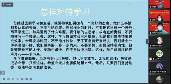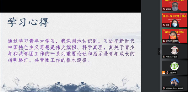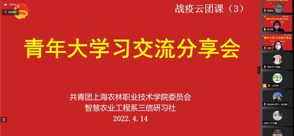 4月14日,院团委、智工系三信研习社联合开展第三期战疫云团课,就团员青年参与青年大学习开展交流分享。院团委、智工系团总支、各系入团积极分子、三信研习社社员、团员青年代表等共计200余名学生在线观看,交流学习心得。