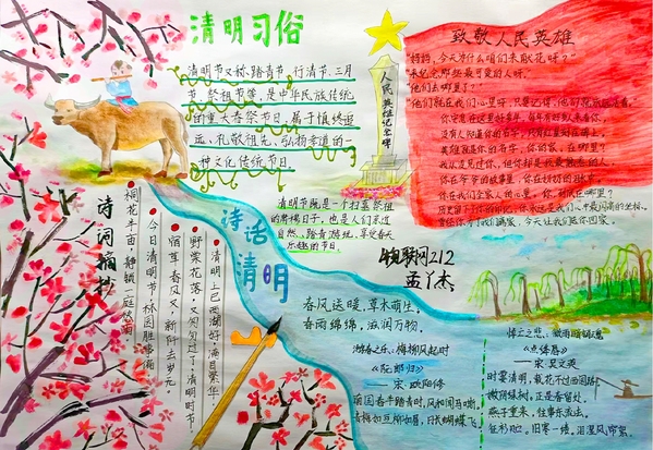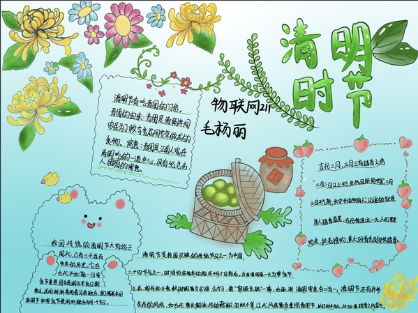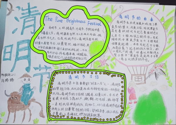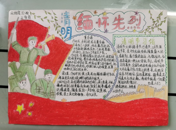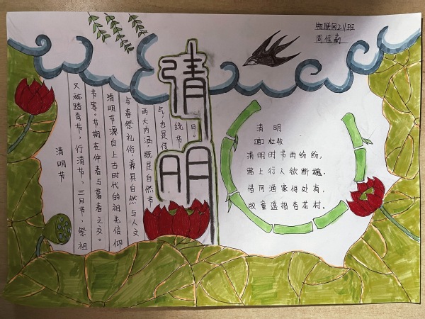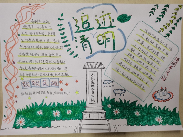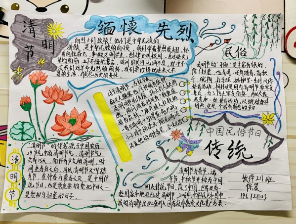 在爱国主义主题团日活动和“线上观影室”打卡活动中,智工系各团支部组织团支部成员在线鲜花祭扫,向先贤先烈鞠躬献花,向抗疫英雄送上真挚的感言寄语,带领同学们在爱国主义影片中感受先贤先烈的英勇无畏,在抗疫故事视频中表达对一线工作者的崇高敬意,看到感人动情处,软件201班张巧霞同学坚定地说:“作为一名当代大学生,作为一名团学骨干,我们定会奋发图强,永存爱国热忱,不辜负这来之不易的和平,对得起抗疫英雄们的付出与努力。”中国传统文化知识竞赛和“阅读马拉松”活动由智工系学科部承办,同学们积极阅读传统文化书目,学习传统文化知识,了解传统节日的由来、习俗、精神、文化故事等,在学习中发现传统文化的魅力,增长知识底蕴,树立文化自信。在“追迹先人”手抄报活动中,同学们发挥艺术特长,精心绘制,每一份作品都饱含对先辈的无限追思、对英雄的庄严致敬,其中,物联网211班毛杨丽的作品清新脱俗,既充满趣味性与知识性,又暗含对疫情过后多彩生活的期待。
