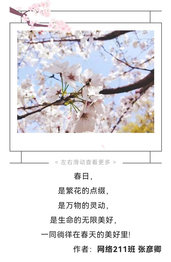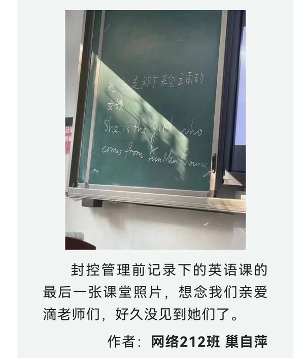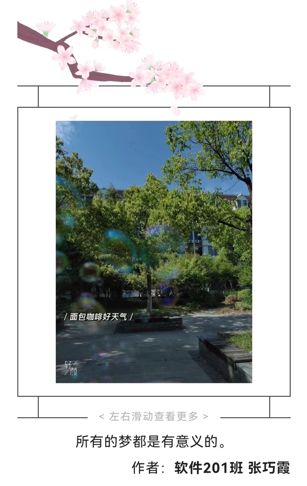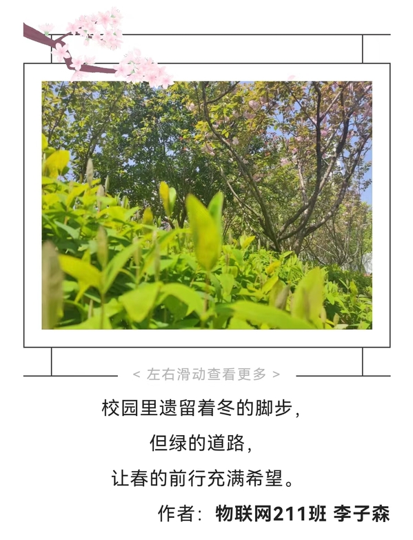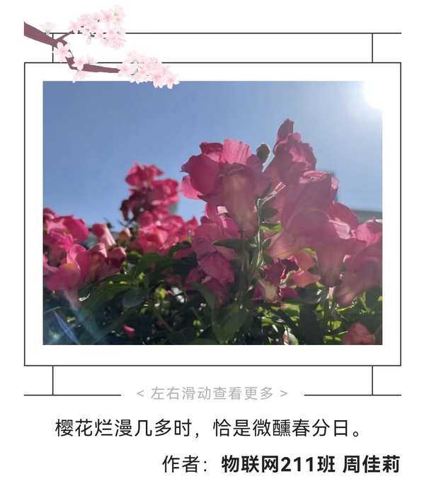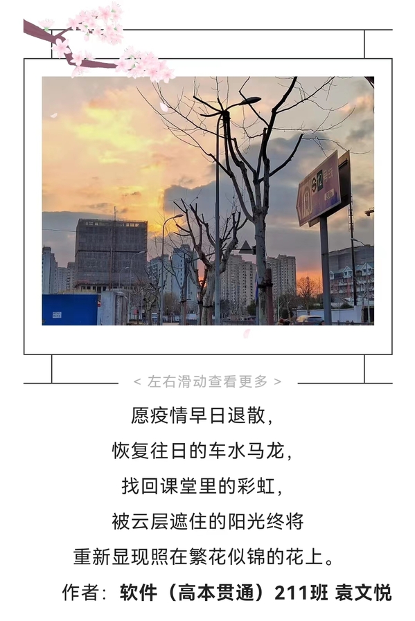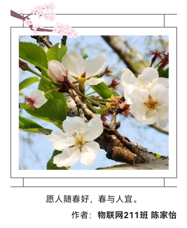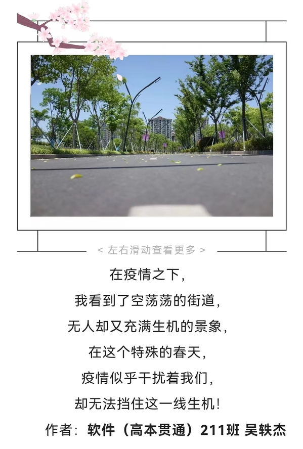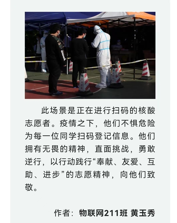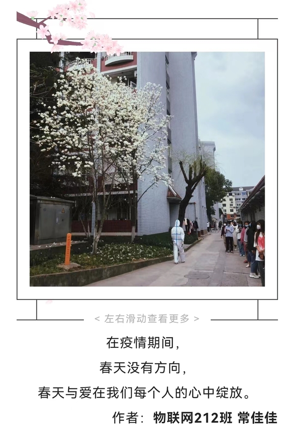 在“追寻最美春天”摄影比赛和“抗疫最美风景”活动中,同学们通过抓拍美丽春景、记录志愿服务工作、观看抗疫视频等,分享自己的所思、所想、所感,表达对抗疫一线工作人员的敬意和对美好生活的热爱。在拍摄志愿者搬运物资时,物联网211班朱雨豪坚定地说:“疫情无情,人有情。在这众志成城的抗疫合力之下,我相信我们上农人定不会被这疫情打倒,我们定能取得这次疫情的胜利。上农人,加油!”