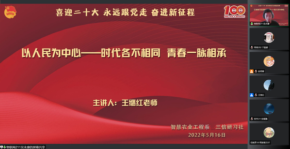 青春孕育无限希望,青年创造美好明天,为引导智工系广大青年学子不忘初心、牢记使命,坚定信念、紧跟党走,5月16日,智工系团总支组织学生理论社团线上开展“以人民为中心——时代各有不同,青春一脉相传”主题云团课,三信研习社社员、各班级团支书、入党积极分子、团员青年代表等近百名学生共同学习。团课主讲人为马克思主义学院专任教师王继红老师。