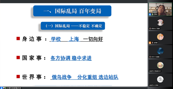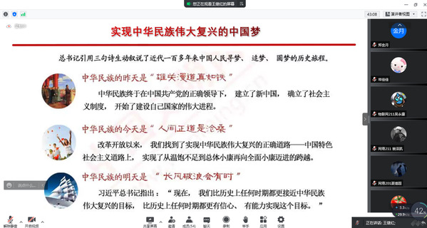 本次团课历时1.5个小时,同学们收获良多,纷纷发表感想:“从身边的疫情到国家、国际发展大势,课程内容丰富,王老师讲得非常精彩。在疫情逐渐好转的当下,我们仍要坚持做好个人防护,配合疫情防控管理,调整好心态,认真上网课,利用即将到来的假期给自己充电,多读书、多实践、多奋斗,因为奋斗是青春最亮丽的底色,行动是青年最有效的磨砺,有责任有担当,青春才会闪光!”