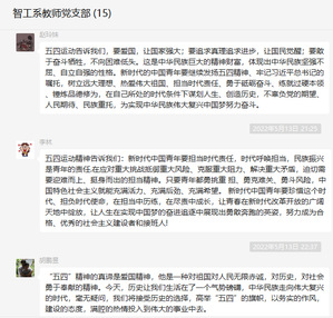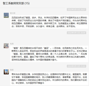 随后,各位党员老师们轮流与大家交流分享了学习心得与体会。党支部书记孙修东同志说:“我们要不断提升教书育人本领,争做‘经师’和‘人师’的统一者,以模范行为影响和带动学生,做润己泽人的人民教师。”王妍发言:“作为一名职业教育工作者,为祖国培养有理想、有担当、有能力的青年,是职责,也是使命。注重课程思政教育,引导学生在自己的岗位上发光发热,成长为社会主义合格的建设者和接班人,是青年党员教师对五四精神最好的诠释。”李嘉说:“时代在变,五四精神没变!作为一名教师,在坚持线上教学的同时,积极参与社区抗疫志愿者服务,是对五四精神的致敬!”