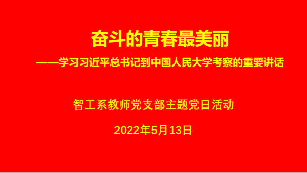 5月13日晚,智工系教师党支部通过腾讯会议的形式在线上开展了以“奋斗的青春最美丽”为题的主题党日活动。此次活动由教师党支部副书记虞亚楠主持,全体党员参加。活动以五四青年节为主题,专题学习了习近平总书记4月25日在中国人民大学考察时的重要讲话。