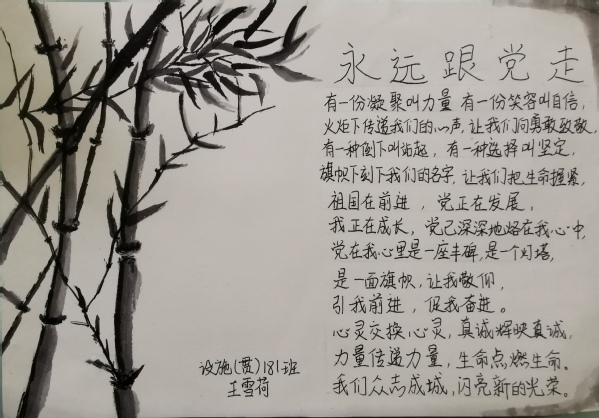 前期预热,原创作品感党恩。在五四青年节前后,智工系学子积极参加“喜迎二十大、永远跟党走、奋进新征程”主题作品征集活动,围绕建团百年、喜迎二十大、五四青年节、青年现象、青年故事等内容,绘制手抄报、朗诵爱国主义诗歌、分享学习重要讲话原文心得体会等,同学们以青春向伟大思想致敬,更加坚定了永远跟党走、青春当奋斗的理想信念。设施中高贯通181班团支书王雪荷《永远跟党走》作品融合中国传统绘画技巧,以国画题材——竹为点缀,“君子如竹”,寓意高远、超凡不俗,语言文字坚定,给人以振奋,正如作品中写到的“力量传递量,生命点燃生命,我们众志成城,闪亮新的光荣。”