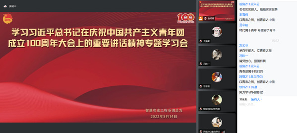 骨干领学,专题学习共奋进。智工系团学骨干、各基层团支部书记、团员代表、入党积极分子等青年学子线上开展“学习习近平总书记庆祝中国共产主义青年团成立100周年大会上的重要讲话精神”专题学习会,共同学习讲话原文,深刻领会共青团紧跟党走过的光荣历程,感受习近平总书记对青年一代的关心关爱,在评论区大家纷纷写下“请党放心,强国有我”“时代属于青年,时代寄语青年”等有担当、有力量的豪言誓词。