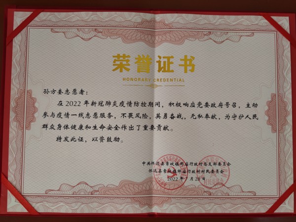 孙方奎的志愿服务工作也得到了社区的肯定,社区为他颁发了荣誉证书。感谢他积极响应党委政府号召,主动参与疫情一线志愿服务,不畏风险,英勇奋战,无私奉献,为守护人民群众身体健康和生命安全作出了重要贡献。