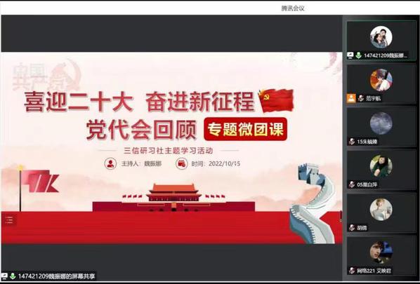 10月15日上午,在中国共产党第二十次全国代表大会召开之际,智工系学生理论社团——三信研习社线上组织重温学习党的历届代表大会,三信研习社社员、智工系团学骨干、各班级班委、团员青年代表等107人参加学习,同心喜迎二十大。