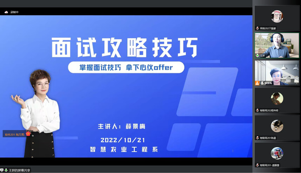 为疏解就业痛点,打通就业难点,帮助毕业生破解就业难题,实现高质量就业,智工系用心护航2023届毕业生求职之路,开展《就业赋能,“职”面未来》系列活动。10月21日下午,智工系邀请人力资源实战专家薛景梅老师线上开展面试攻略技巧讲座,引导学生提升自身就业核心竞争力,讲座由智工系副主任王妍老师主持、毕业班辅导员和2023届毕业生参加。
