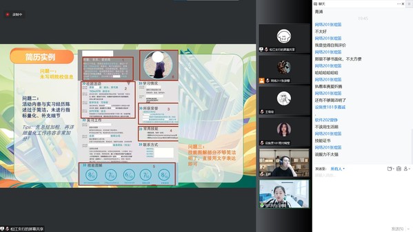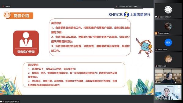 为加强2023届毕业生实习就业指导服务,提高同学们的求职竞争力,11月9日,智工系组织线上企业宣讲会暨职业发展指导,上海农商银行松江支行副主任王骁颖、智工系副主任王妍,智工系2023届毕业生和辅导员参加。