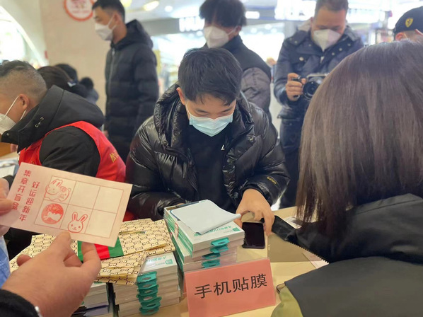 物联网211班俞文恺则负责群众贴完手机膜后的敲章工作,参与者凭借敲满活动印章的卡片可以领取一份幸运盲盒小礼品。活动结束后,物联网211班俞文恺表示:“在本次寒假活动实践中我接触到了各行各业的服务人员,在工作岗位上必须要知道做什么、怎样做,而且要尽自己努力认真完成。对于在校大学生来说,实践是检验学习的最好途径,如果只学习不实践,那么这一切都等于零,只有把学习和实践结合起来才能更好的服务社会。”