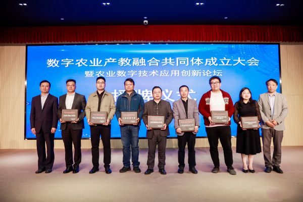 学院党委书记蔡红、市计算机行业协会秘书长裘维东为数字农业产教融合共同体成员单位授牌。