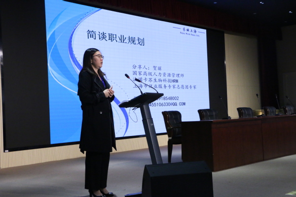 5位企业专家均是上海市创业指导专家志愿团的志愿者,来自各行各业,具有十分丰富的职场实战经验。贺丽老师是上海卡苏生物科技有限公司人力资源经理,她结合十年以上大型外资企业、民营企业人事管理工作经验,从什么是职业生涯规划、为什么要有规划以及怎么做等三大方面,为同学们带来了实用的生涯建议和深刻的职业思考。