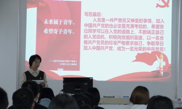 会上,王璐以“请党放心,强国有我”为主题为新生上党课,详细讲解了党的发展历程、党的基本知识、党的光辉事迹以及党员发展流程,使新生对党有了更加清晰的认识。同时,王璐还结合优秀毕业生先进党员事迹,对新生如何在学习、工作和生活中发挥党员先锋模范作用提出了具体要求和建议。她希望同学们树立正确的入党动机,在思想上旗帜鲜明、学习上守正创新、工作上模范带头、生活上严于律己。