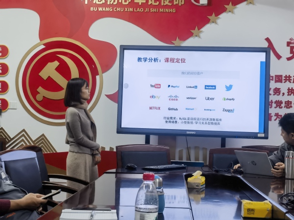 软件技术专业新入职教师王悦对《MySQL数据库》这门课程从教学设计、教学实施、教学效果、教学创新和不足等几个方面进行说课,全面展现了自己对课程的理解以及教学程序。说课过程中,新教师教态自然、吐字清晰,教学目标、教学内容完整合理,展示了多样化的教学资源和创新的教学方法。系部专业负责人及骨干教师对新教师的表现予以充分肯定,并提出更高要求。同时,老师们进行了激烈的讨论,新老师提出自己对课堂或教学的疑惑和困难,老师们也给新老师提供了很多帮助和建议。