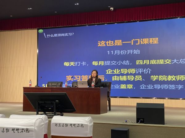 会上,赵文旻首先强调了实习的重要性,叮嘱学生在实习过程中把安全放在首位;其次对实习目的、实习时间、实习方式、实习要求、实习考核等实习工作有关事宜作解释说明;接下来其鼓励学生考一些专业且含金量高的技能证书,提升就业竞争能力;最后其对学生的一些疑惑进行现场解答。
