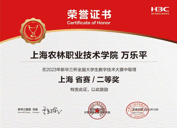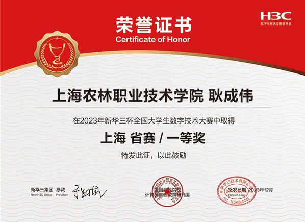 近日,2023第十三届“新华三杯”全国大学生数字技术大赛上海市赛获奖名单揭晓,学院智慧农业工程系学生获一等奖、二等奖各1项。