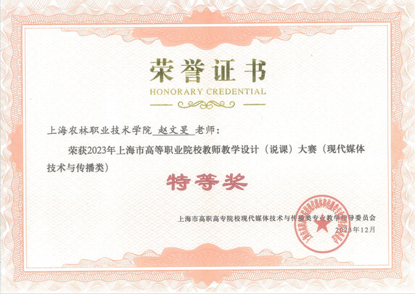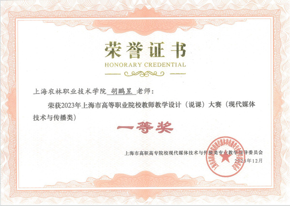 近日,从上海市高职高专院校现代媒体技术与传播类专业教学指导委员会获悉,智工系赵文旻、胡鹏昱两名教师分别获2023 年上海市高等职业院校教师教学设计 (说课) 大赛决赛特等奖和一等奖。