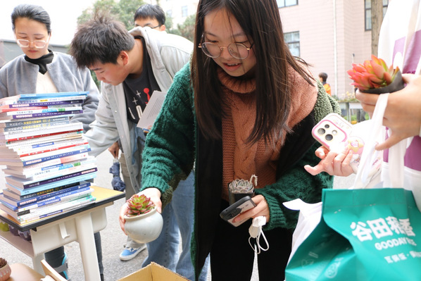 活动于当日11:00准时开始,一经推出便受到了师生的热捧,多名参与者都踊跃献出自己保存完好的图书,置换绿植小盆栽。学生们带来的书籍种类丰富,既有经典文学作品,也有专业教材和教辅书籍,每一本都承载着知识的力量,经过严格的筛选,所有书籍均符合活动要求。现场气氛热烈,学生们排队等候,相互交流着自己带来的书籍和喜欢的绿植。一个中午时间,就有八十余本图书被回收,共置换绿植四十余盆。
