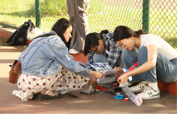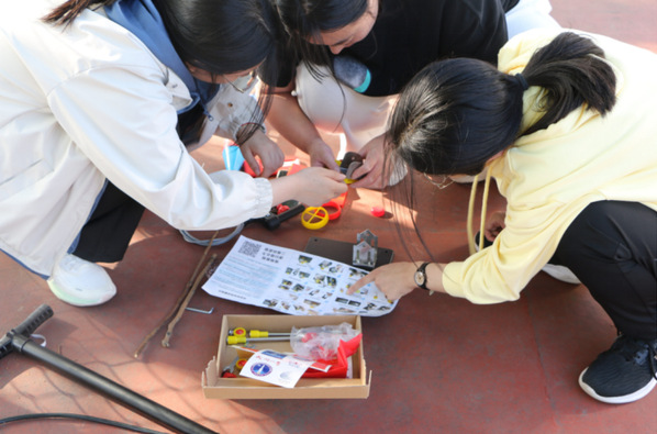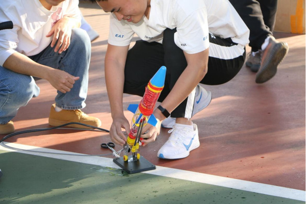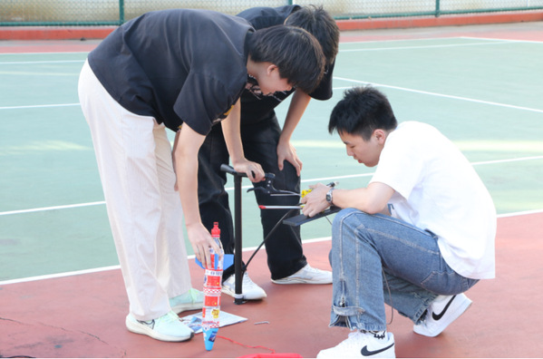 活动于4月22日至30日开展前期报名工作,以 3人为团队参加比赛,共10组队伍。活动伊始,学生各自划分区域,每组配备有矿泉水、打气筒和组装零件等参赛物料。随着裁判发令,各团队快速查看水火箭发射说明书、组装水火箭发射架以及拼接水火箭,分工迅速合理。炎热的天气下,学生们研究水火箭的热情愈加强烈。在最后的发射阶段,现场志愿者对学生遇到的“水火箭无法喷射”、“水火箭喷射高度不高”等问题耐心指导,帮助大家顺利完成飞行,体会科技的吸引力。