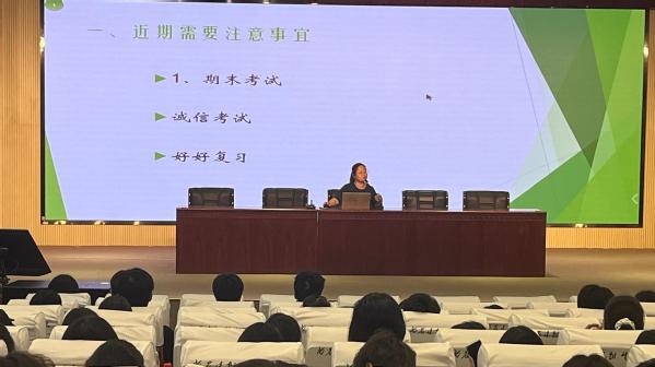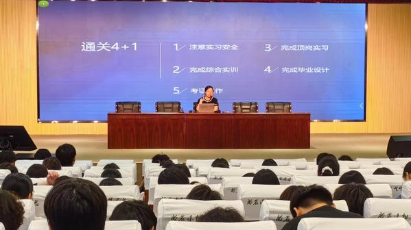 会上,赵文旻强调了实习安全问题,提醒同学们在实习过程中要时刻保持警惕,保障自身安全。同时,对综合实训、顶岗实习和毕业设计这三方面的内容进行了详细阐述,为同学们明确了实习期间的各项任务和要求。辅导员李苏琳重申了考试记录的严肃性和诚信的重要性,鼓励同学们以真实水平展现自己的学习成果。并就退宿安排、返校安排进行了说明,方便学生提前做好规划。