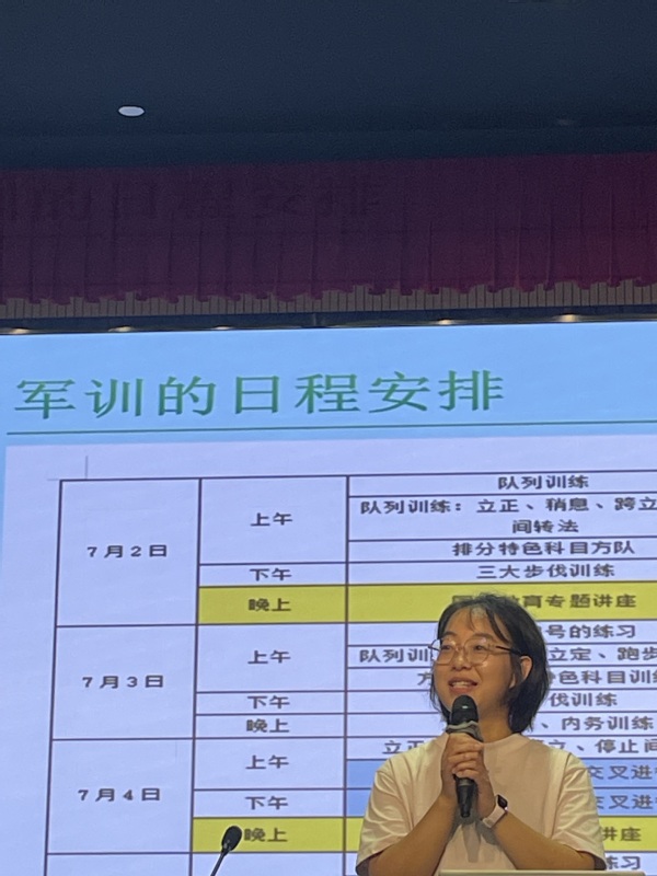 王璐向同学们介绍了军训的日程安排、基本要求和军训期间学生管理规定,明确了军训纪律。要求同学们自觉接受军事化管理,服从领导,听从指挥,以饱满的政治热情、积极的学习态度参加军事训练。并号召同学们要珍惜军训锻炼的机会,将军训视为一次心灵洗礼、责任担当和人生历练,要严格要求自己,发扬不怕苦、不怕累的精神,努力拼搏;要学会关心集体、关爱他人,建立战友情、同学情,增强集体荣誉感;要利用军训的机会培养良好、健康的生活习惯,掌握更多学习和工作所必需的知识和技能。