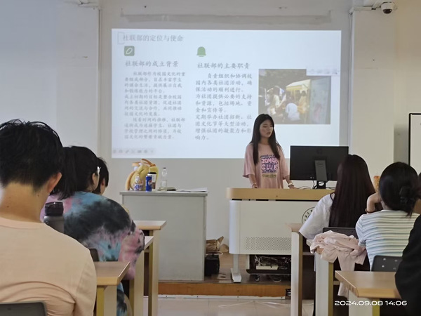 会议伊始,团副戴曦对24级新同学表示热烈的欢迎,并对学生会做了简单的介绍。会上,各部门负责人利用PPT,短视频,表演等多元的宣传方式全方位的展示了各自部门的职责与特色。用精彩的宣讲吸引了在场的新生,使场内氛围和热情一直居高不下。
