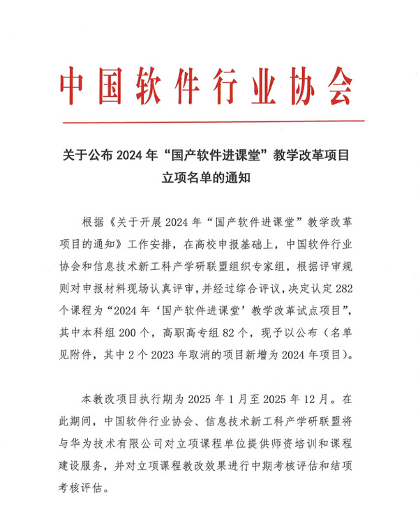 在高校申报的基础上,中国软件行业协会和信息技术新工科产学研联盟组织了专家组,根据评审规则对申报材料进行了现场认真评审,并经过综合评议,最终决定认定282个课程为“2024年‘国产软件进课堂’教学改革试点项目”,其中本科组200个,高职高专组82个。