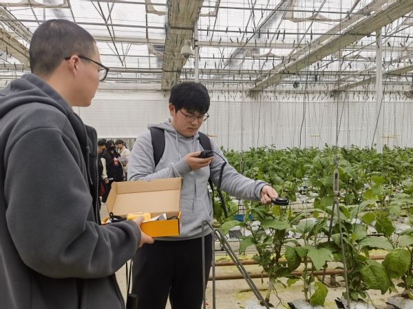 活动中,师生实地考察了实验站的智能温室及配套设施。陈春宏研究员向学生介绍了温室的水肥一体化系统、环境调控设备等现代农业技术的应用场景。学生分组使用专业仪器测量温室内的光照、温湿度等环境参数,结合课堂所学知识分析数据差异。设施农业与装备专业学生表示:“亲手操作设备测量数据,让我对设施环境调控的原理有了更具体的认识。”