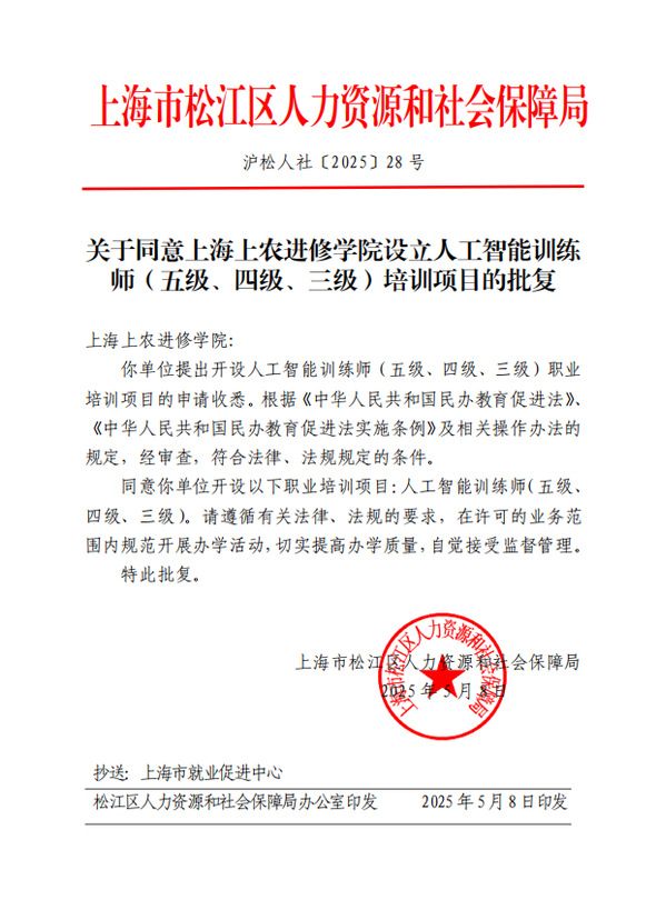近日,上海市松江区人社局批复同意上海上农进修学院设立人工智能训练师(五级、四级、三级)培训项目,学院正式获得本证书的对外培训资质。