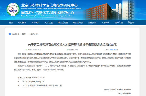 据悉,此次遴选工作严格按照《关于开展第二批智慧农业高技能人才培养基地建设工作的通知》要求,由国家农业信息化工程技术研究中心组织农业农村部、教育部相关专家共同开展。经过专家组严谨评审,全国共确定38所院校为基地建设院校,我院智慧农业工程系凭借在智慧农业专业建设、产教融合实践、技术技能人才培养等方面的突出表现,从众多申报院校中脱颖而出。