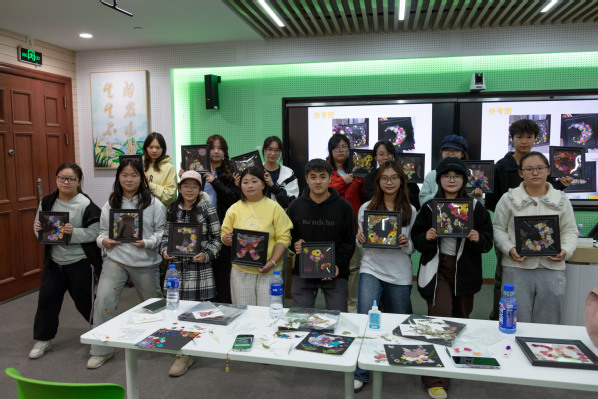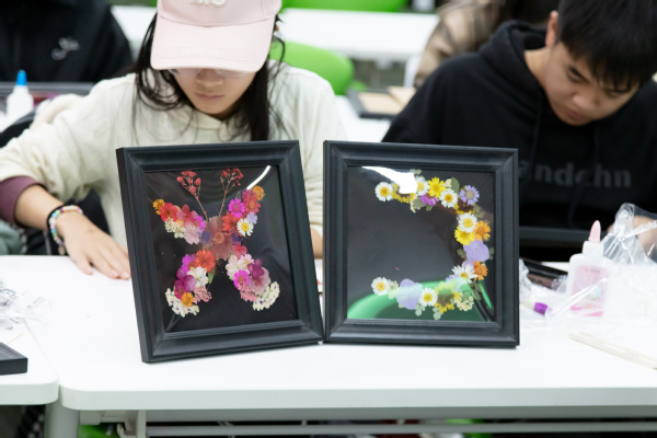 了解基础技巧后,同学们迅速投入创作。大家先精心挑选花材,再按所学方法完成干燥处理,随后进入创意拼贴环节。凭借丰富想象力,同学们将压好的花材组合成各式图案,细心粘贴在相框内,每一件作品都承载着独特创意与情感。最后在工作人员指导下,大家完成装裱收尾,让成品更显精致美观。