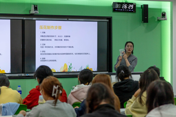 活动伊始,工作人员细致讲解压花艺术的相关知识。压花又称平面干燥花,通过脱水、保色、压制、干燥等科学处理,将植物材料转化为平面花材。从根茎叶到花果树皮,多数植物都可作为创作原料,其成品可应用于画作、卡片、书签等多种场景,为生活注入自然美感。