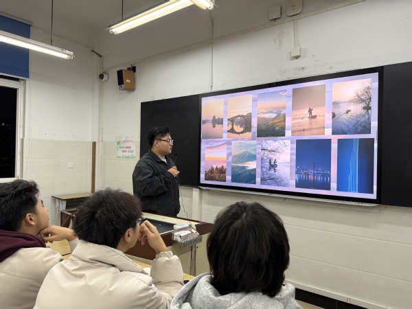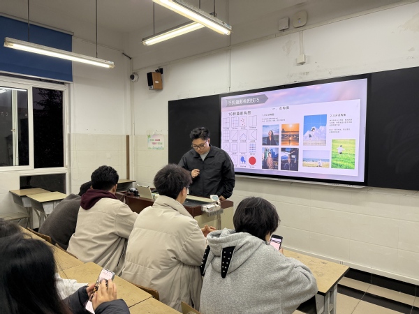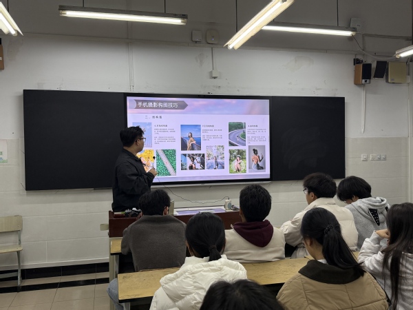 活动伊始,系学生会新媒体部副负责人单益康以“理论讲解+案例剖析”的形式,系统且生动地分享了手机摄影核心技巧。他从三分法、对角线构图等经典构图逻辑切入,逐步深入讲解快门速度、ISO感光度等关键参数的调节要点,全程结合校园风光、生活场景等鲜活案例进行拆解分析,将抽象的理论知识转化为直观可感的实操方法。这种“从理论到实践”的讲解思路,不仅让整场讲座兼具专业性与趣味性,更有效引导同学们建立“理论指导实践”的思维模式,为后续实操环节奠定坚实基础,助力大家在技能学习中提升审美判断与逻辑思维素养。