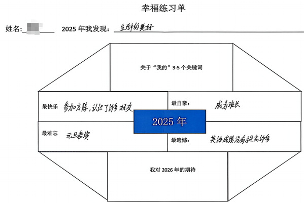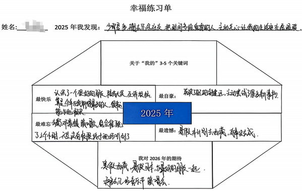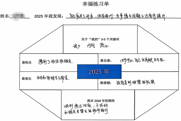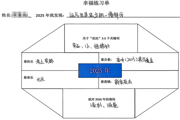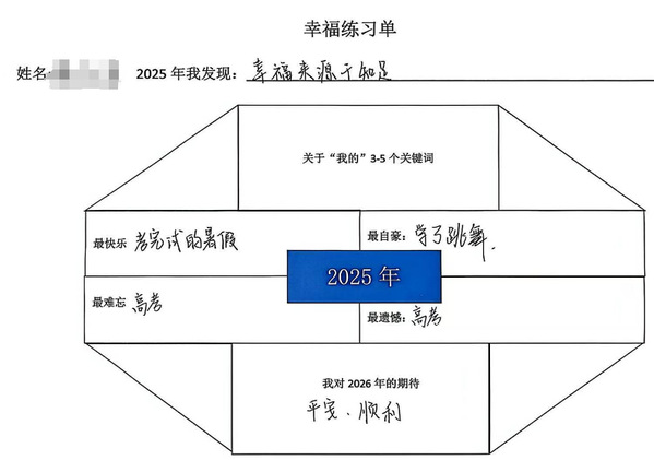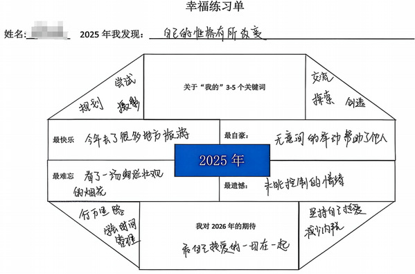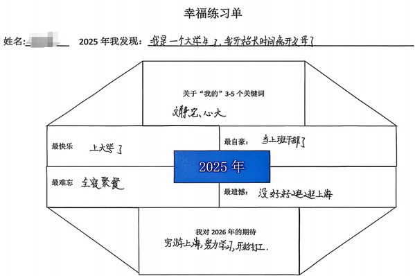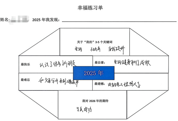 本次《幸福练习单》活动围绕“2025 年我发现”“最快乐”“最自豪”“最难忘”“最遗憾”“2026 年期待” 六大核心维度设计,既契合跨年之际 “复盘过往、奔赴新程” 的情感基调,也贴合学期末 “总结学业、规划未来” 的现实需求,为学生搭建起敞开心扉、真实表达的平台。征集过程中,新生们踊跃参与,用质朴而真诚的文字定格独属于自己的青春印记:有人细数高考落幕的轻松喜悦,记录与家人挚友同行旅途的温暖点滴;有人自豪于独自求学路上的独立蜕变,分享兼职实践中的坚持与收获,也不忘复盘学期内学业上的进步与不足;更有人坦然直面高考失利的遗憾、初入校园的社交融入困惑,在学期末的节点上梳理心结、寻求突破;众多学生还写下对 2026 年的美好期许,“顺利通过英语四级”“扎实掌握专业技能”“结识更多志同道合的朋友”“期末取得理想成绩” 等心愿质朴而坚定,既衔接过往,更锚定新篇。