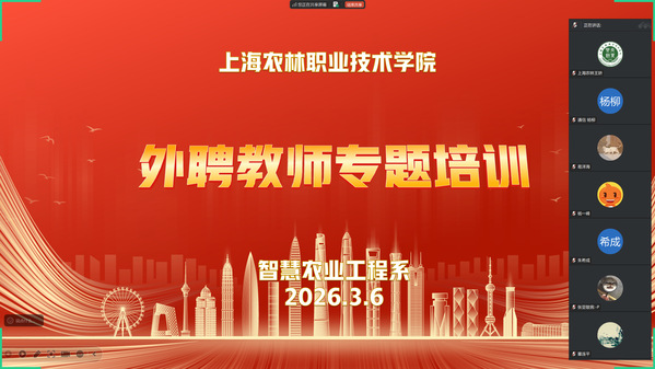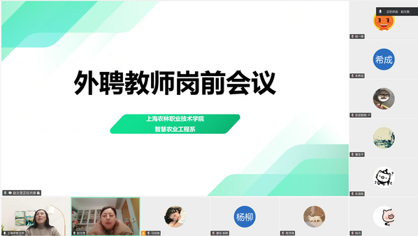 为进一步规范外聘教师教学管理,明确新学期教学工作要求,保障学院教学秩序平稳运行,3月6日,上海农林职业技术学院智慧农业工程系以线上会议形式,顺利召开2025-2026学年第二学期外聘教师岗前培训会。系部负责人王妍、教学副主任赵文旻、教学秘书马佳缘及全体外聘教师参会。