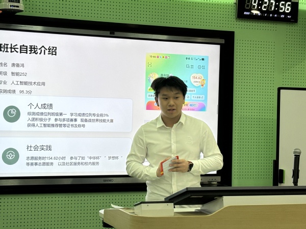 比赛分为风采展示与情景模拟问答两个环节。在风采展示环节,各班班长通过PPT演示、视频展播、案例分享等多元形式,生动展现了班级在学风建设、团队协作、文化营造等方面的特色做法与暖心故事。这些实践正是智工系“六位一体”育人体系的生动缩影——该体系通过充分动员学生多听、多看、多研、多思、多悟、多实践,引导学生在行业讲座、企业参访、课题调研、主题班会、榜样分享、志愿服务与技能竞赛中全面提升综合素质,实现从被动接受到主动成长的转变。